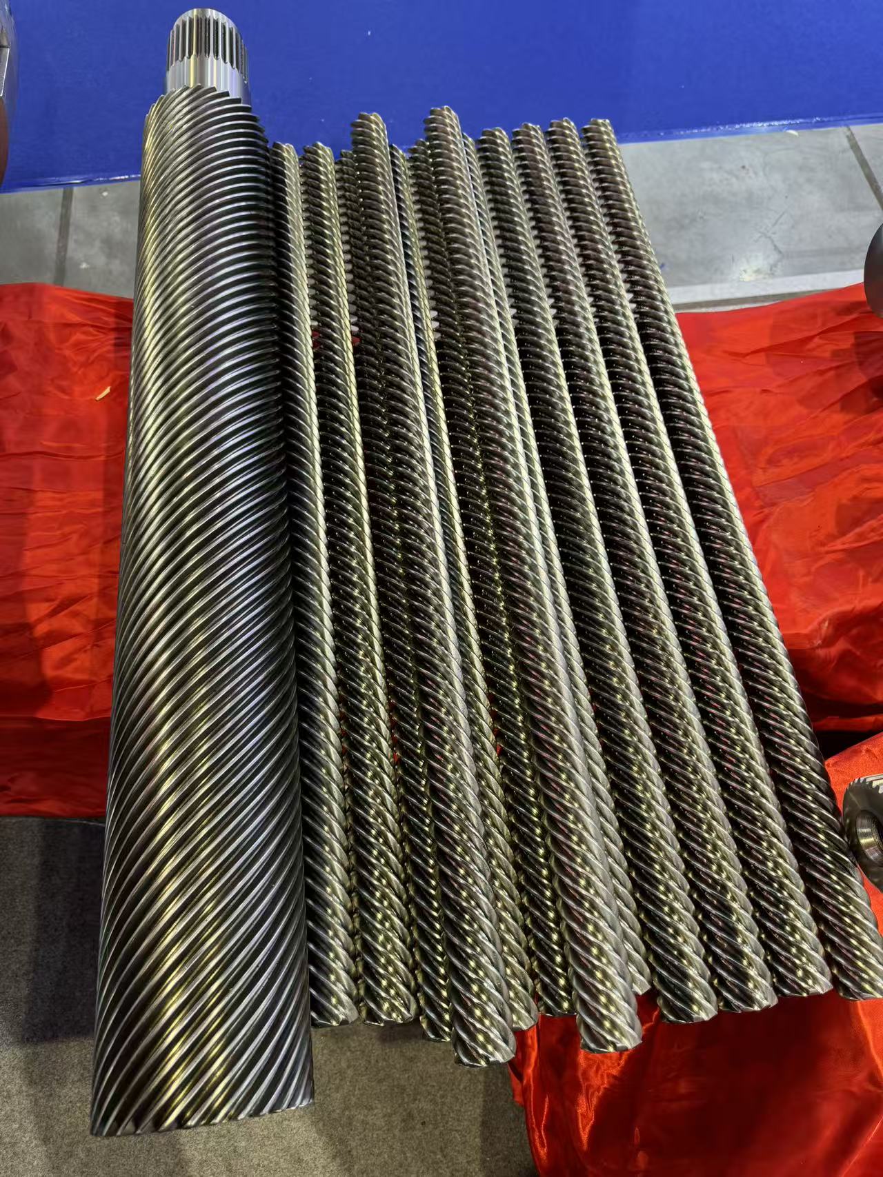 The booth was professionally arranged, and the products were displayed in an orderly manner, including various specifications of screw components (twin-screw, planetary screw, special head screw, etc.), fully demonstrating the company's R&D strength and manufacturing level.